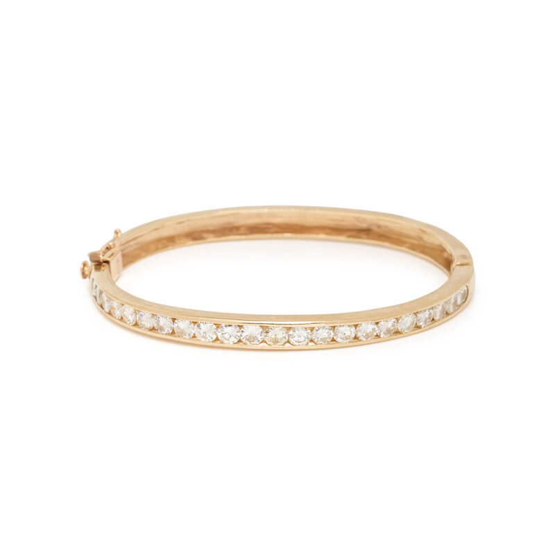 Round brilliant cut diamonds weighing approximately 3.30 carats total, hinged with side clasp. 14 karat yellow gold. 6 1/2 inches inner circumference.