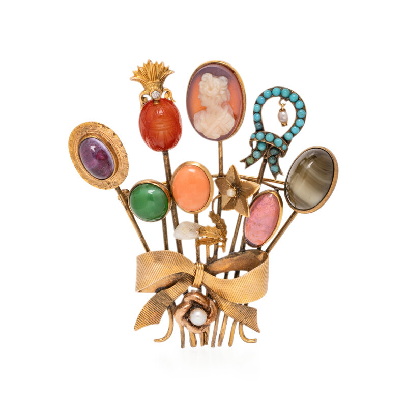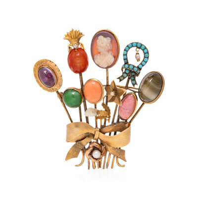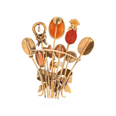 Set with coral, pearl diamond, and variously colored glass. Yellow gold. 2 1/2 x 2 1/4 inches.