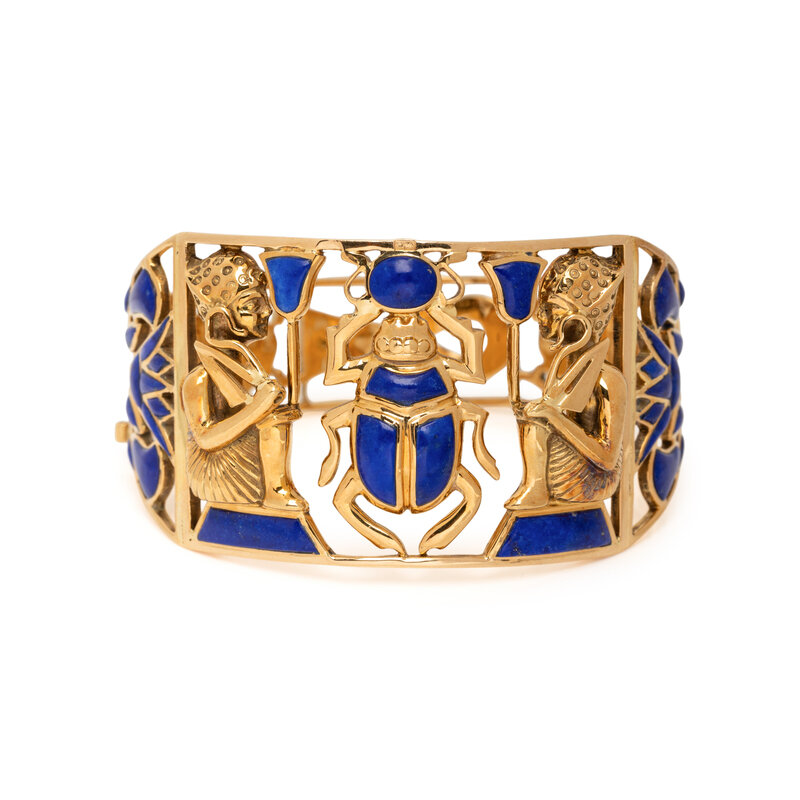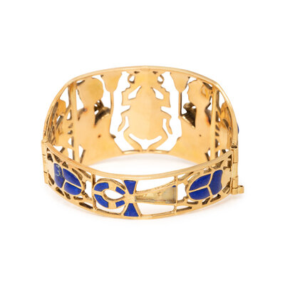 Egyptian motif lapis lazuli inlay, hinged with side clasp. Yellow gold. 7 1/2 inches inner circumference.