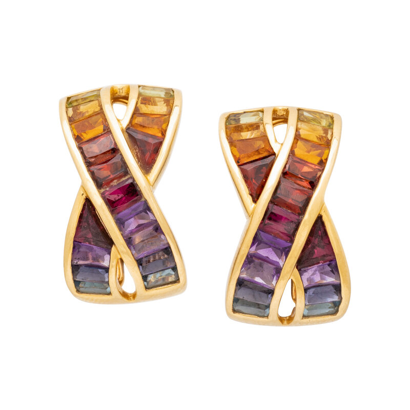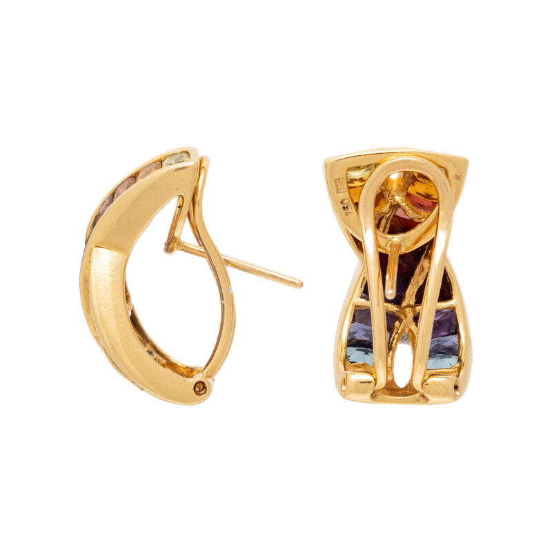 Set with various multicolored gemstones including, citrine, amethyst, tourmaline, blue topaz and garnet, posts with clip backs. 18 karat yellow gold. 13/16 inch long.