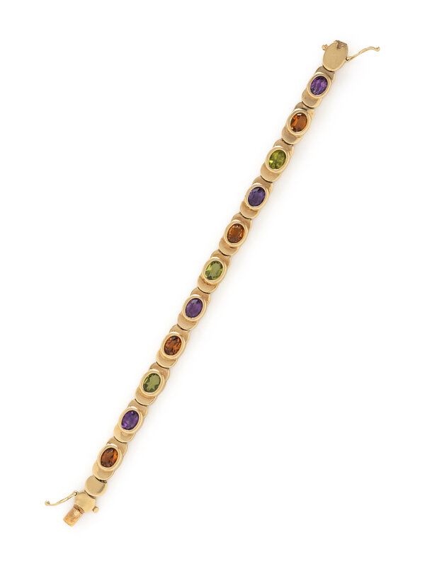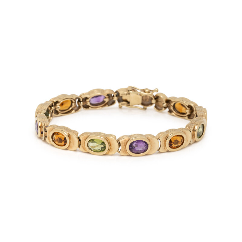 Oval faceted gemstones including citrine, amethyst, and peridot. 14 karat yellow gold. 6 7/8 inches long.