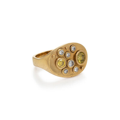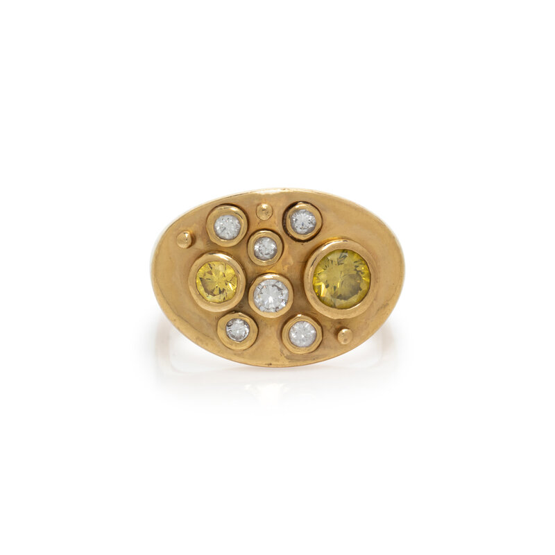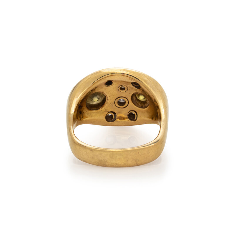 Round brilliant cut diamonds and yellow diamonds (origin of color not tested). Yellow gold. Ring size 8.