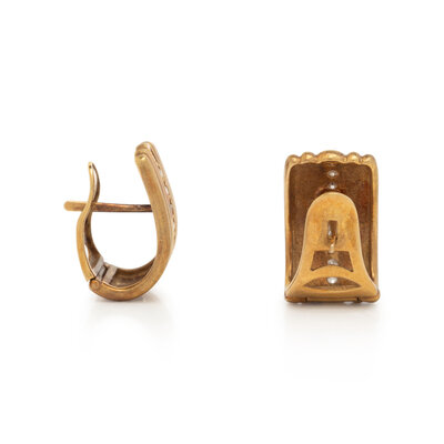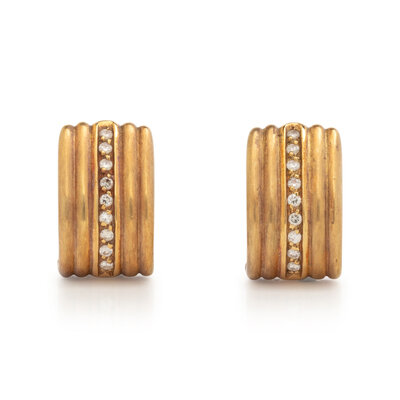 Round brilliant cut diamonds, posts with clip backs. Yellow gold. 5/8 inch long.