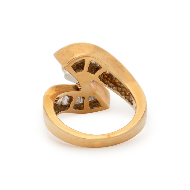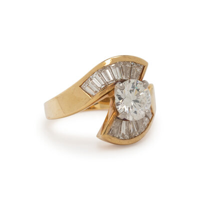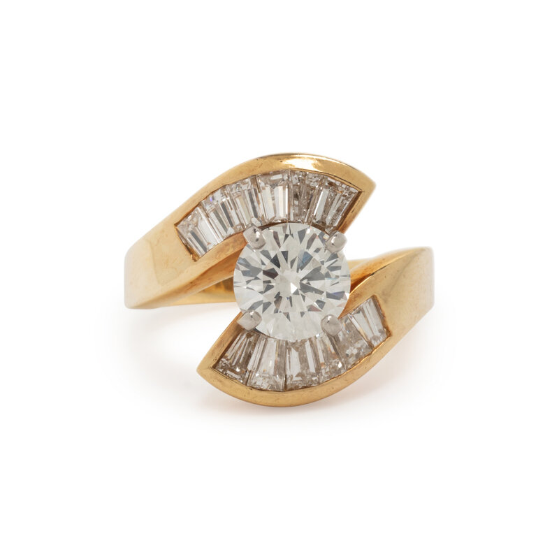 Round brilliant cut diamond weighing 1.75 carats, and tapered baguette cut diamonds weighing approximately 1.15 carats total. 18 karat yellow gold. Ring size 6.
