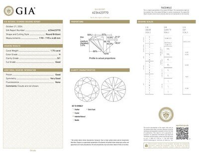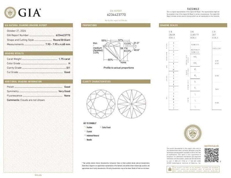 GIA 2024, Report No. 6234423770, 1.75 carats, H color, SI1 clarity, No fluorescence