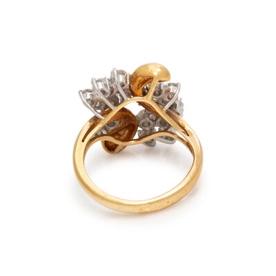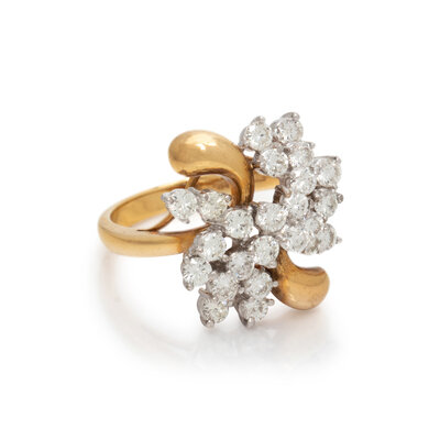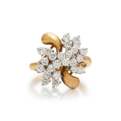 Round brilliant cut diamonds weighing approximately 1.00 carat total. 18 karat yellow and white gold. Ring size 5 3/4.