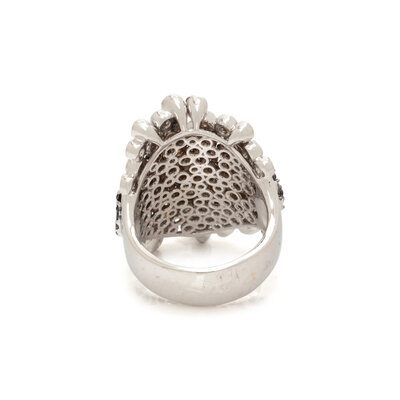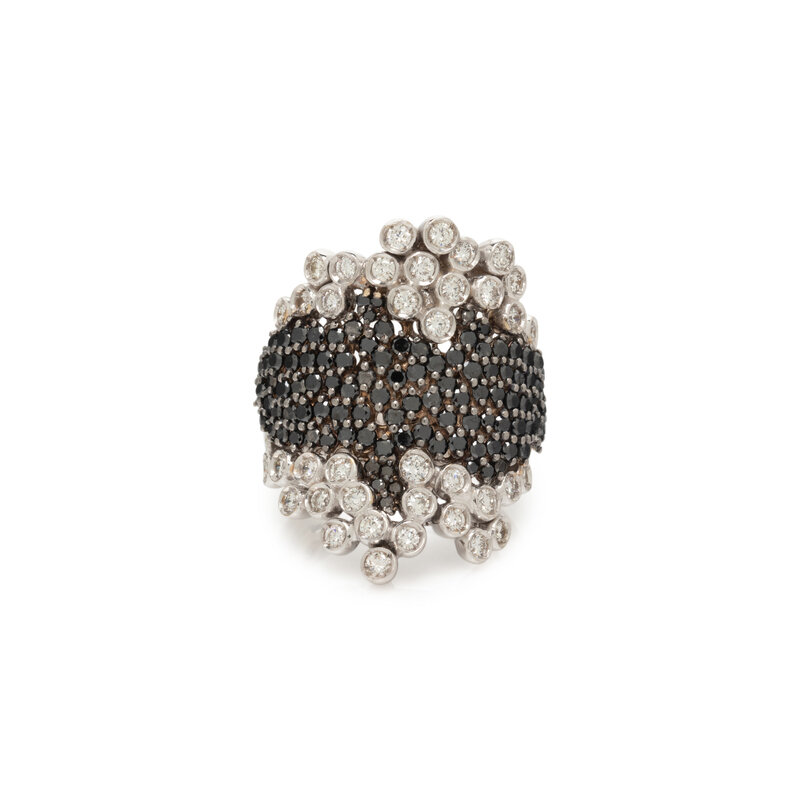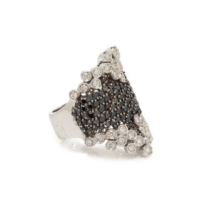 Round brilliant cut diamonds weighing approximately 1.50 carats total and black diamonds (origin of color not tested). 18 karat white gold. Ring size 8.
