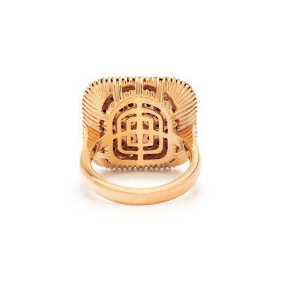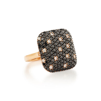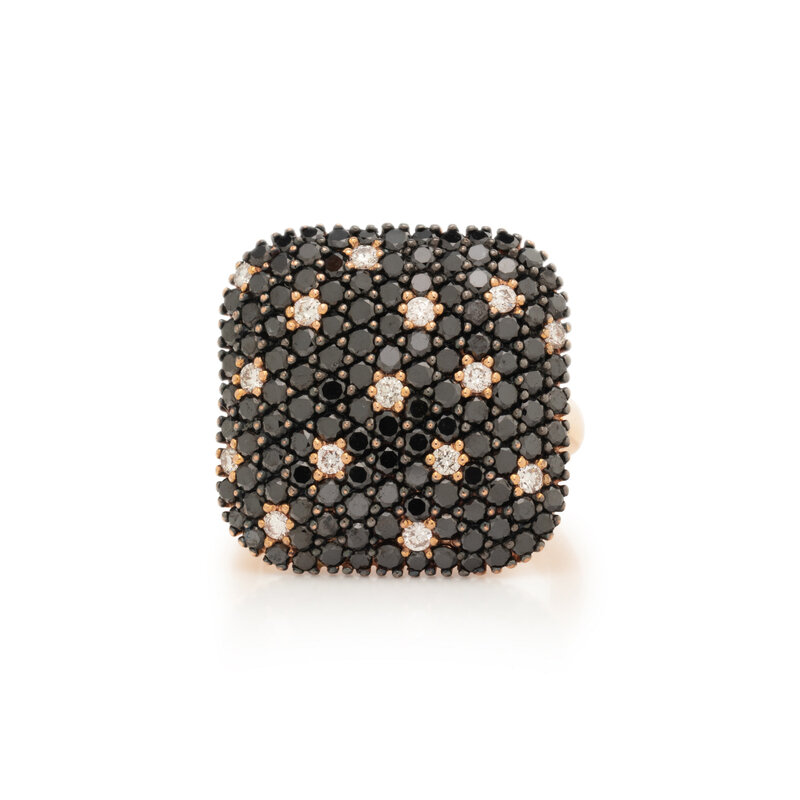 Round faceted black diamonds (origin of color not tested) and round brilliant cut diamonds. 18 karat rose gold. Ring size 7 1/4.