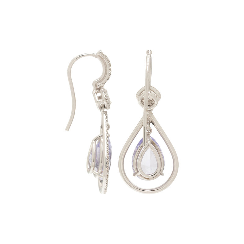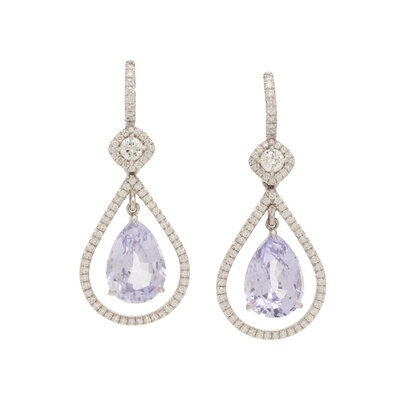 Pear cut purple spinel measuring approximately 11.00 x 7.80 x 4.85 mm and round brilliant cut diamonds weighing approximately 0.70 carats total. White gold. 1 1/2 inches long.
