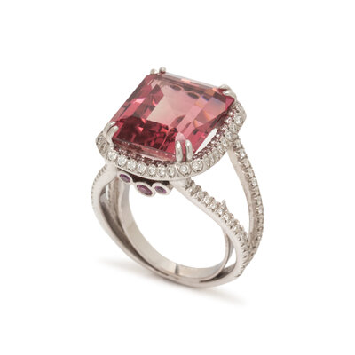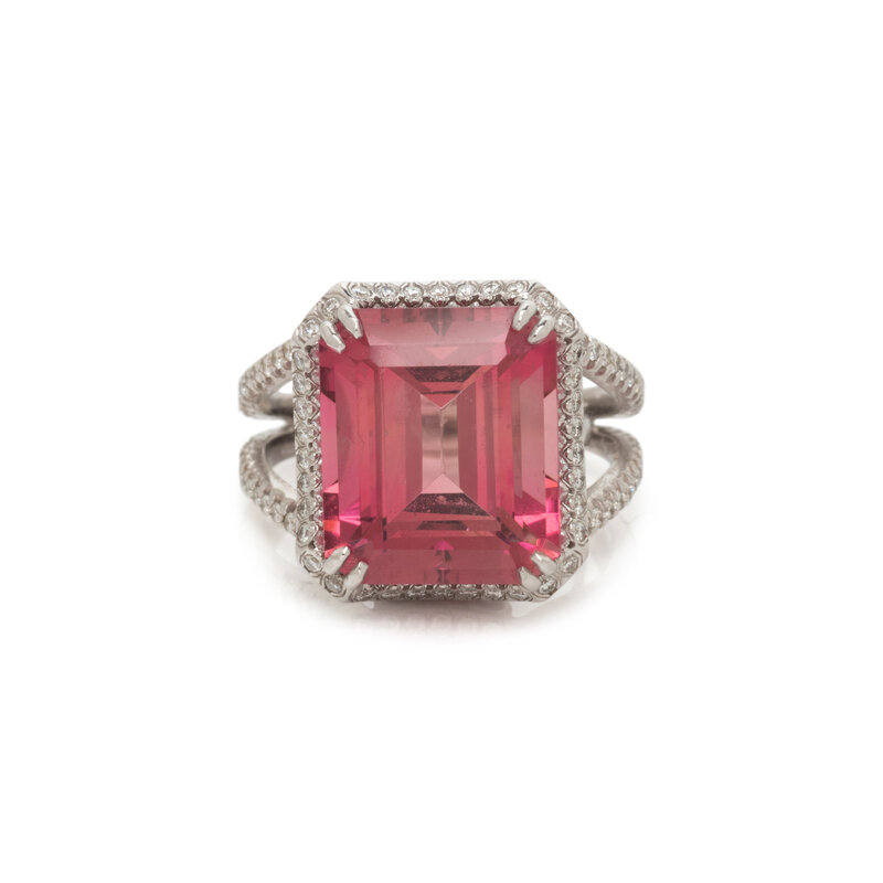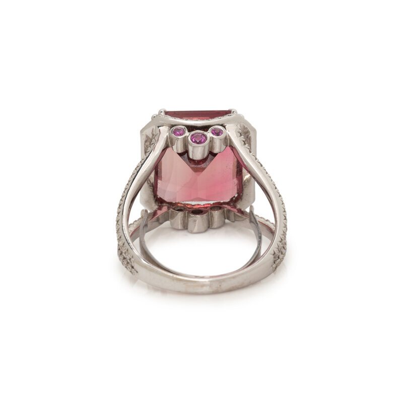 Emerald cut pink tourmaline measuring approximately 13.50 x 11.50 x 8.05 mm, round brilliant cut diamonds weighing approximately 0.50 carat total, and round faceted pink sapphires. 18 karat white gold. Ring size 6 1/2.
