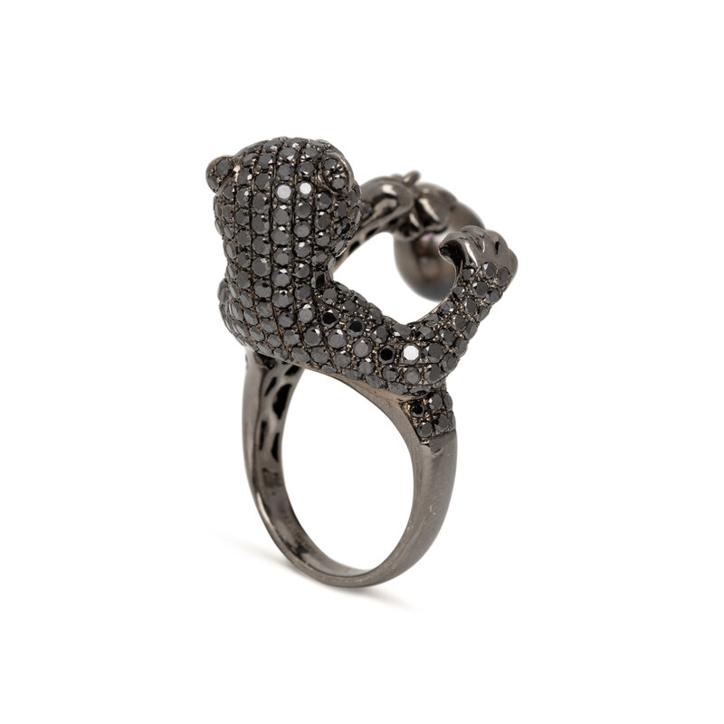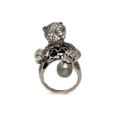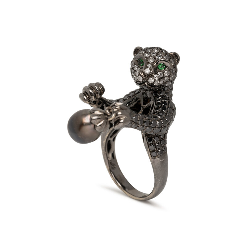 WENDY YUE, DIAMOND, CULTURED PEARL, AND BLACKENED GOLD PANTHER RING