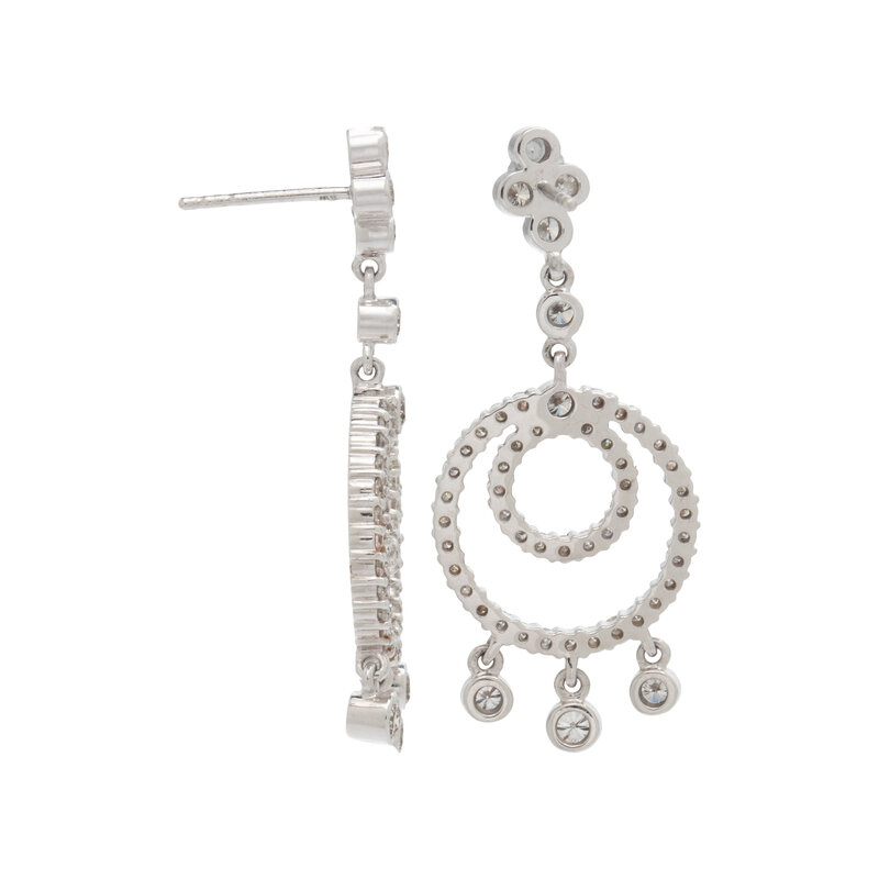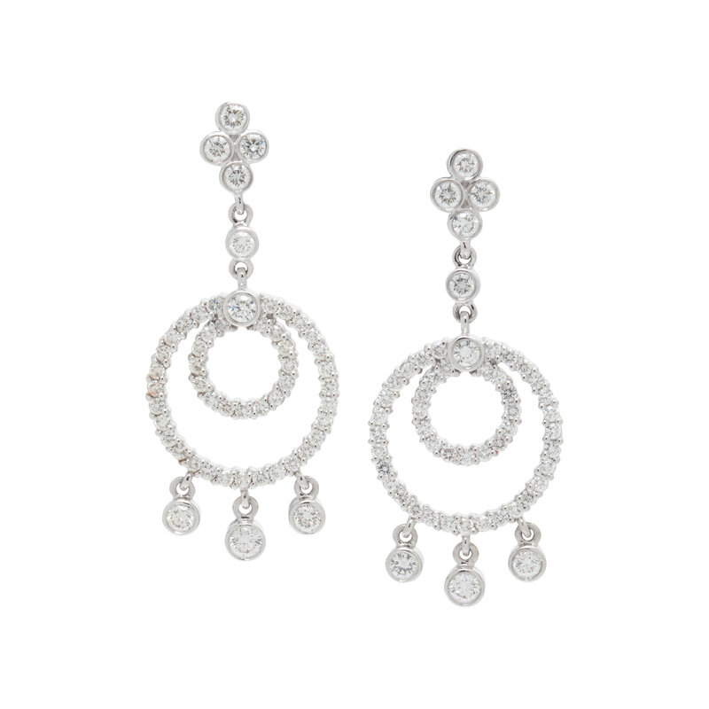 Round brilliant cut diamonds weighing approximately 2.00 carats total. 18 karat white gold. 1 1/2 inches.