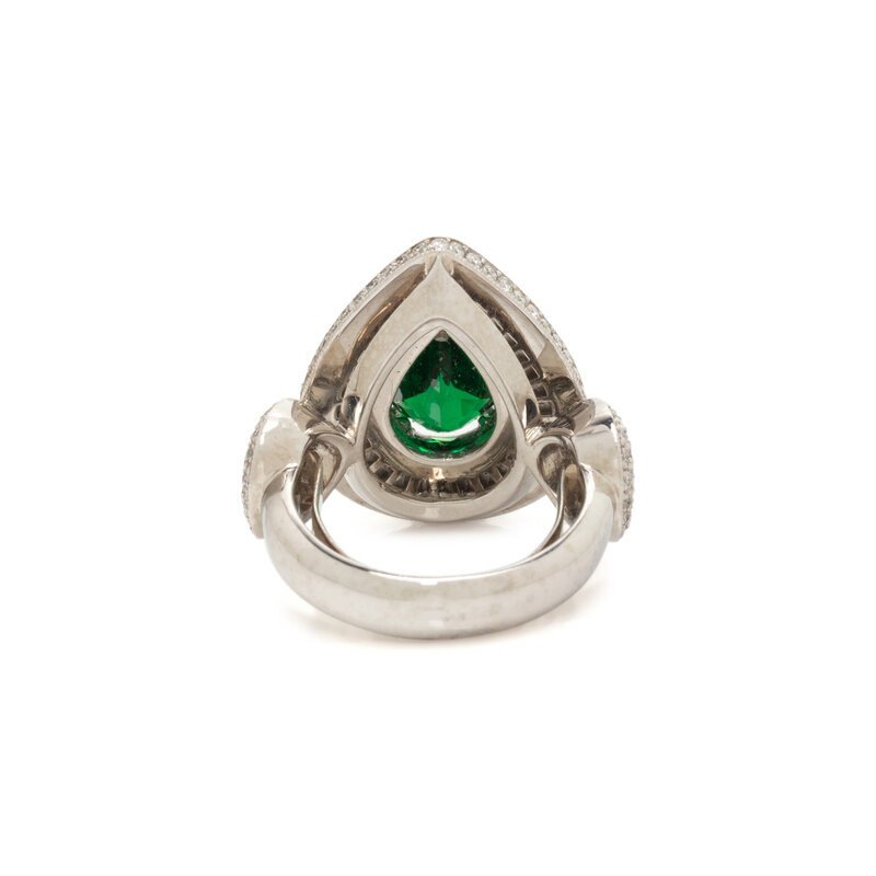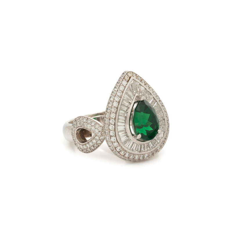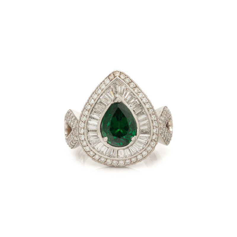 Pear shaped tsavorite garnet measuring approximately 10.00 x 7.00 mm, and round brilliant and baguette cut diamonds weighing approximately 1.75 carats total. Platinum. Ring size 5 1/4.