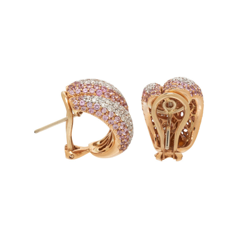 Round brilliant cut diamonds weighing approximately 1.48 carats total, and round faceted pink sapphires weighing approximately 2.51 carats total, posts with clip backs. 18 karat rose gold. 5/8 inch long.