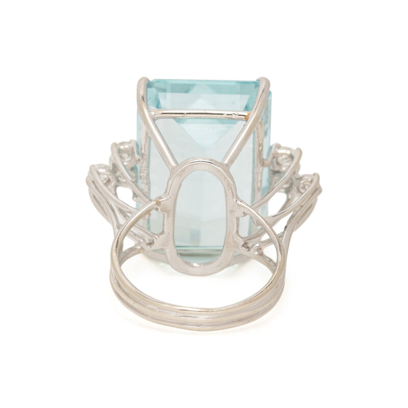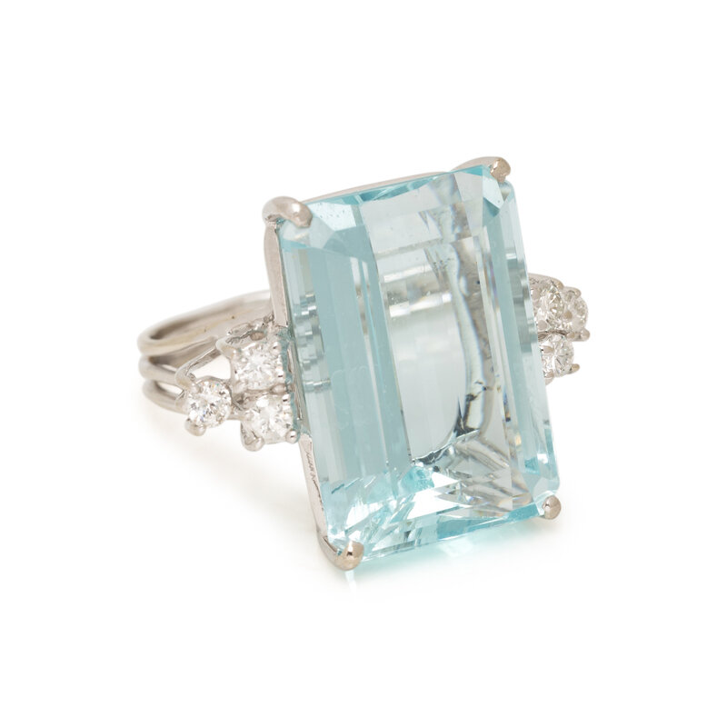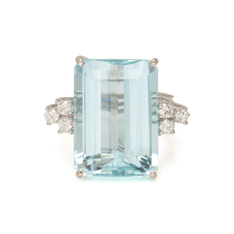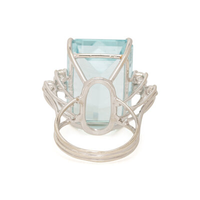 Emerald cut aquamarine measuring approximately 21.25 x 15.15 x 10.30 mm and round brilliant cut diamonds weighing approximately 0.50 carat total. White gold. Ring size 6 1/4.