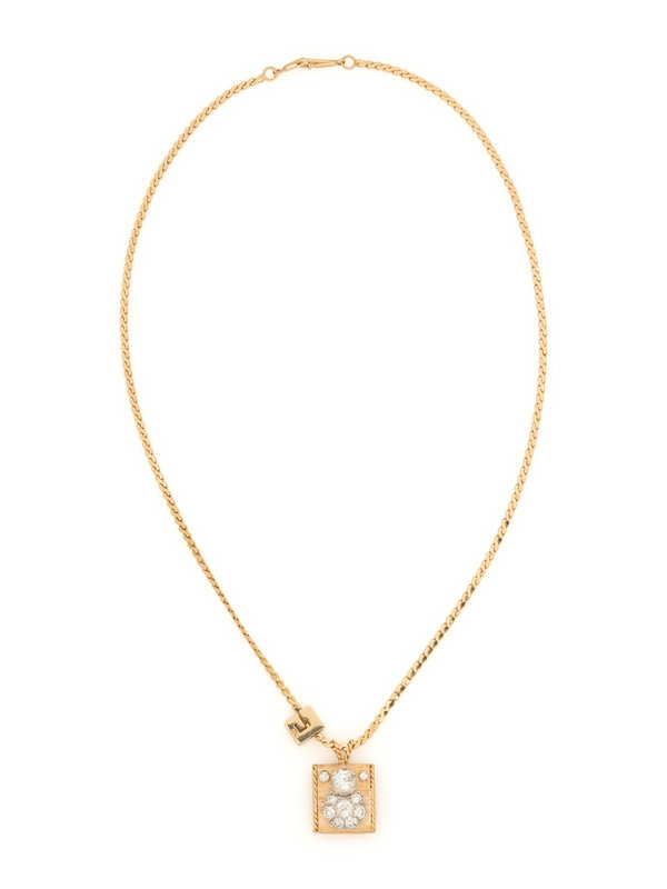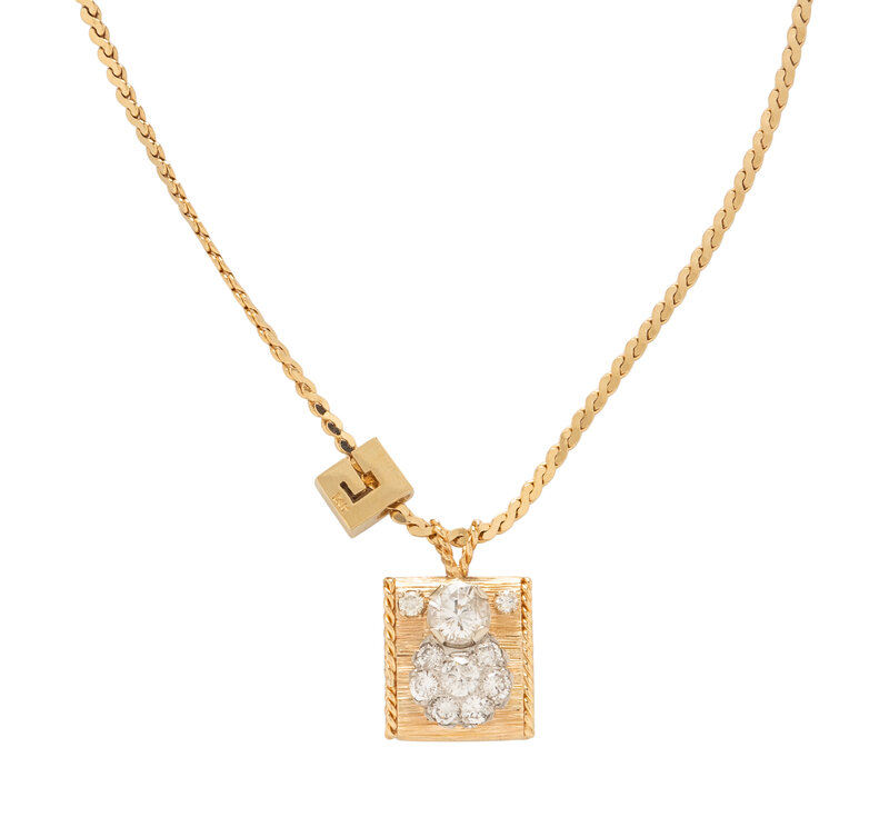 Round brilliant cut diamonds weighing approximately 1.25 carats total. Chain: 16 inches long. Diamond pendant: 3/4 inch long. G charm: 1/4 inch long.