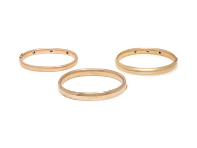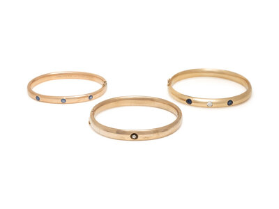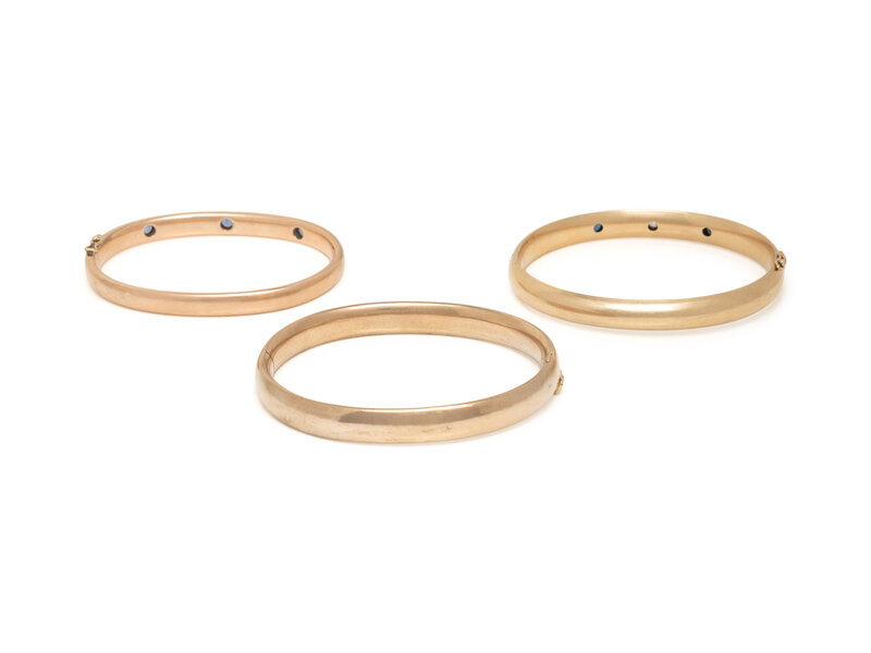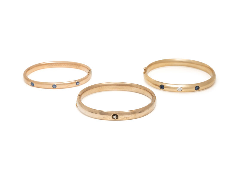 One containing three round faceted sapphires, one containing two round faceted sapphires and an old European cut diamond, and one containing an old European cut diamonds, all hinged with side clasp. Yellow gold. 6 3/8 inches, 7 inches, and 7 inches inner circumference.