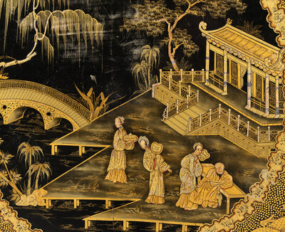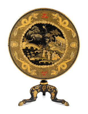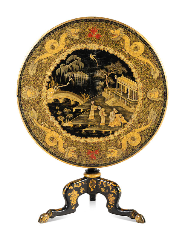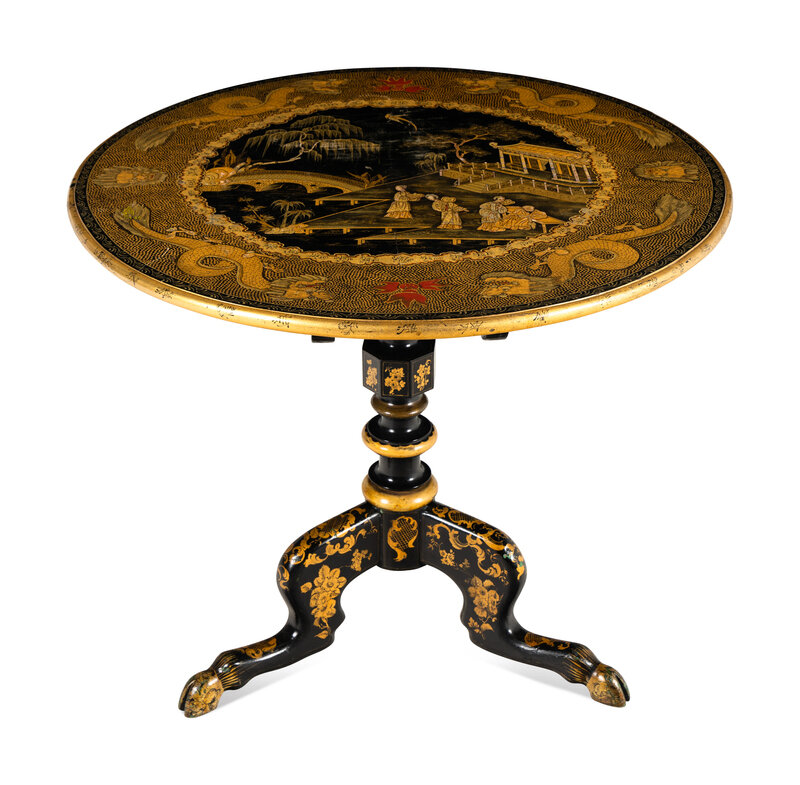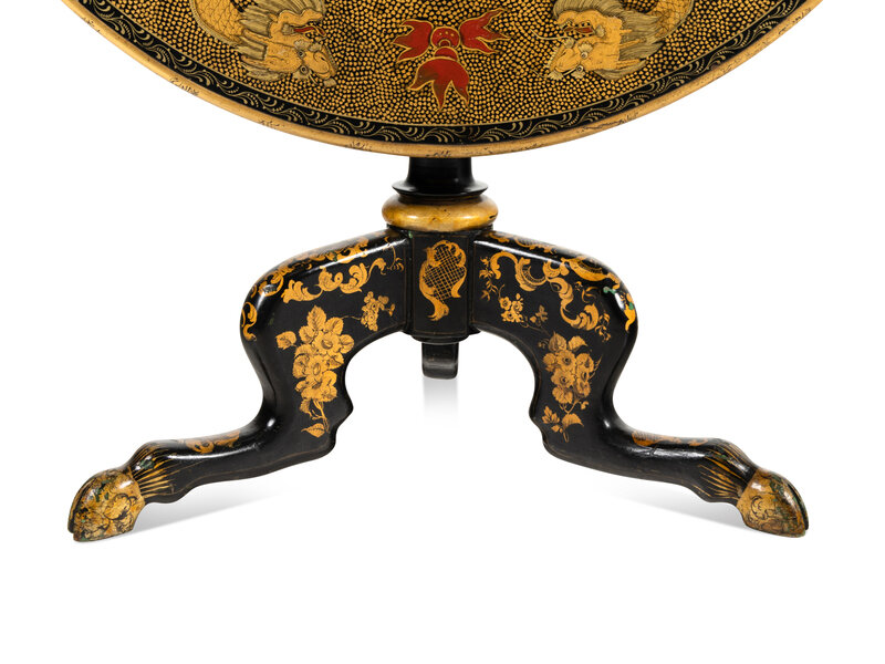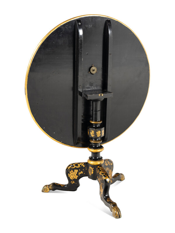 A Regency Style Lacquered and Gilt Decorated Tilt Top Tea Table