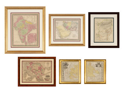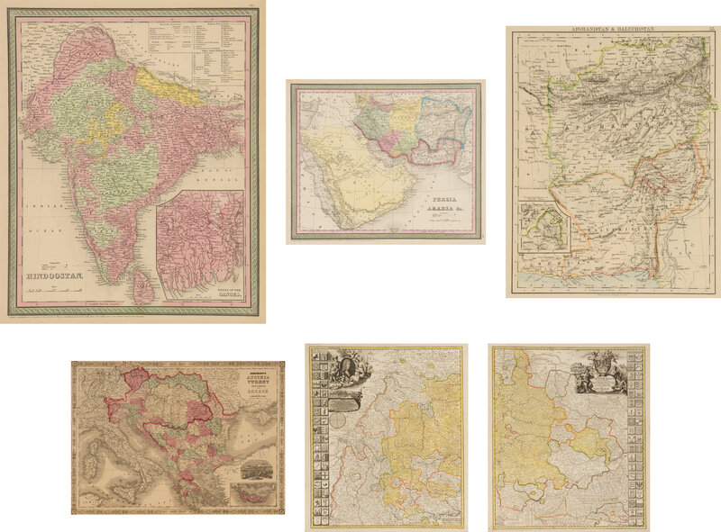 HOMANN, Johann Baptist. Ducatus Wurtenbergici. Ca. 1716. On 2-sheets, framed separately. -- MITCHELL, Samuel Augustus. Hindoostan. PA: Thomas Cowperthwait & Co., 1850. -- MITCHELL, Samuel Augustus. Persia Arabia &c. PA: Thomas Cowperthwait & Co., 1854. -- JOHNSON, Alvin Jewitt. Austria, Turkey, in Europe and Greece. New York: A.J. Johnson, 1864. -- Afghanistan & Baluchistan. Edinburgh and London: W. and A.K. Johnston, 1899.