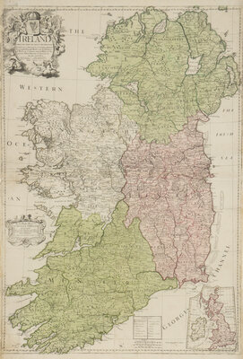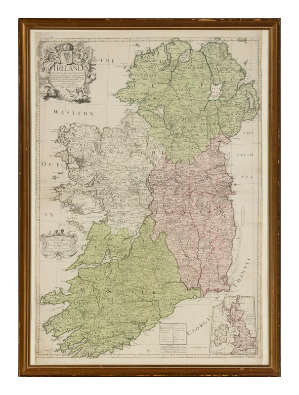 Engraved double-page map on two sheets joined, with hand-coloring. Framed and glazed, sight 1003 x 637 mm. Large decorative cartouche adorned with a Celtic harp, inset map of the British Isles. (Few marginal repairs, some creasing and soiling, mainly near edges.) Not examined out of frame.