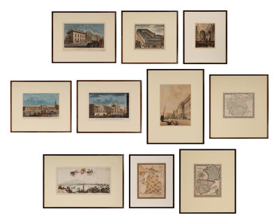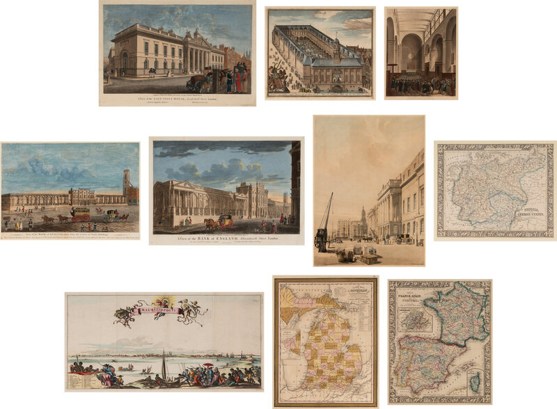 DE WIT, Frederick. La Boursse. Amsterdam, c. 1649? -- OGILBY, John. Mauritiopolis. London, 1671. -- View of the Bank of England, taken from the Corner of Bank Buildings. London, c. 1783. -- A View of the Bank of England. London: Bowles & Carver, 1797. -- A View of East India House. London: Bowles & Carver, 1802. -- ROWLANDSON & PUGIN. New Stock Exchange. London: R. Ackermann, 1809. -- BOYS, Thomas Shotter. The Customs House. London, 1842. -- MITCHELL, Samuel Augustus. A New Map of Michigan. Philadelphia, 1846. -- MITCHELL. Prussia, and the German States. Philadelphia, 1860. (Trimmed to plate). -- MITCHELL. Map of France, Spain, and Portugal. Philadelphia, 1862.