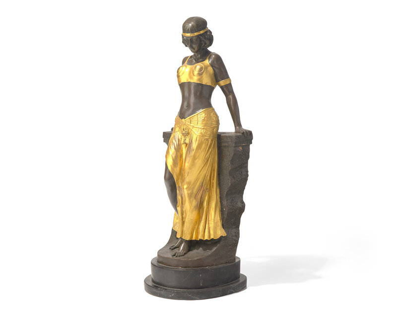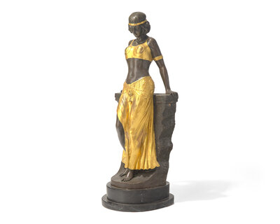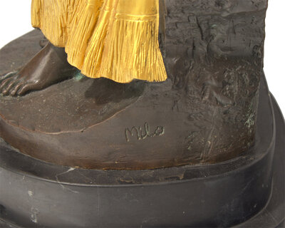 An Art Deco bronze sculpture of a female Egyptian dancer with gilding on the figure's dress. Inscribed on the lower left side "Milo"