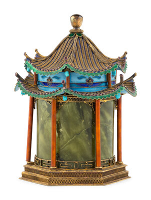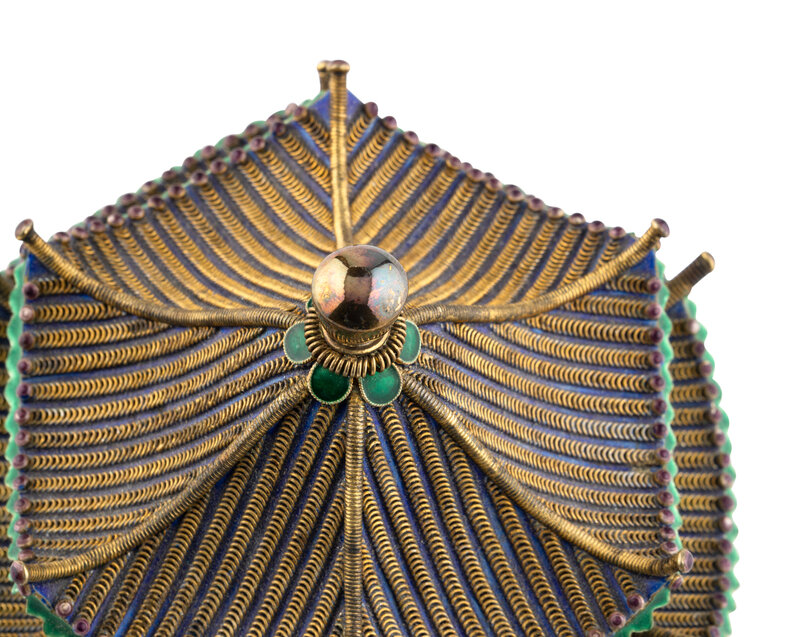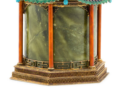 A Chinese Enameled and Hardstone Pagoda-Form Box