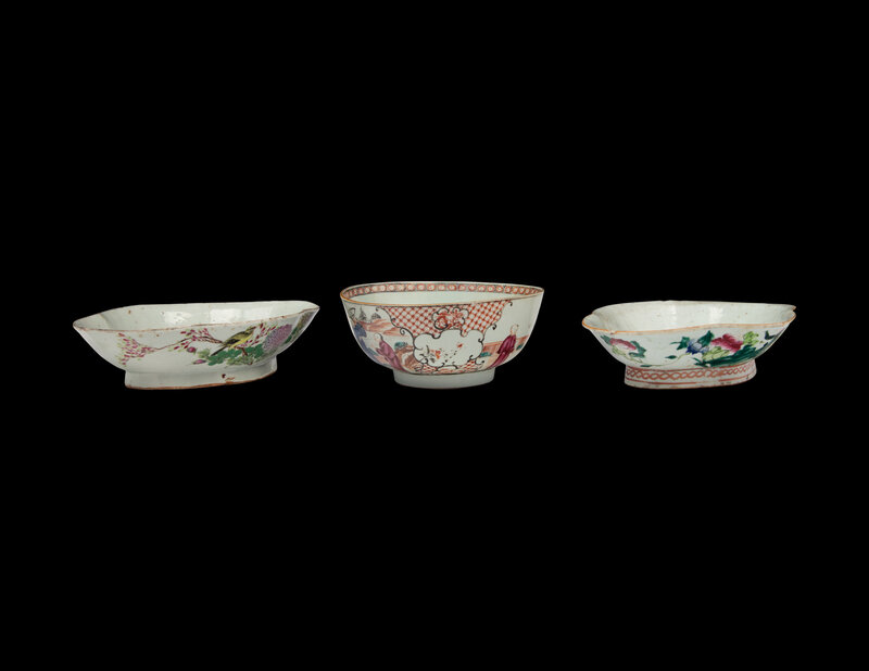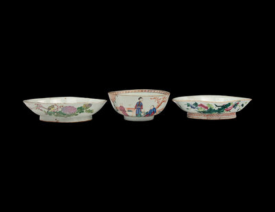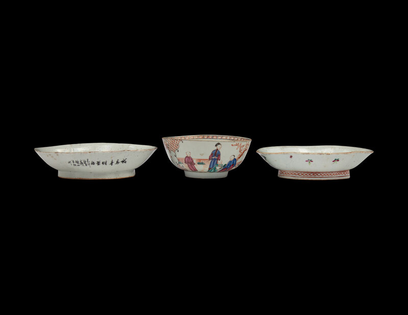 comprising two floriform examples painted with flowering branches and birds, a rounded example with figures.