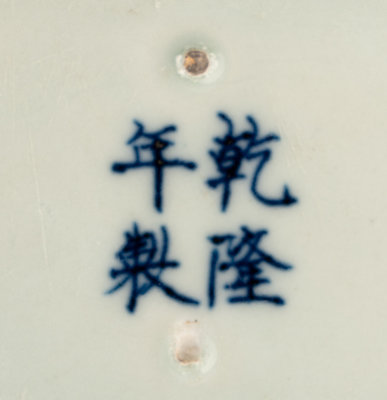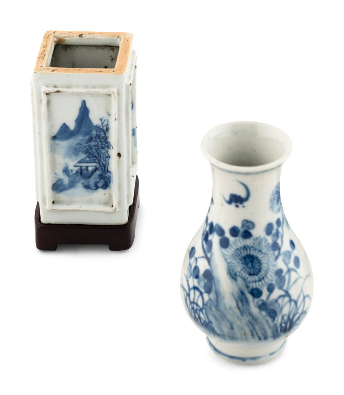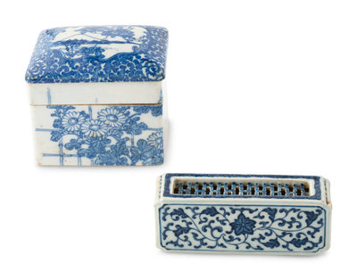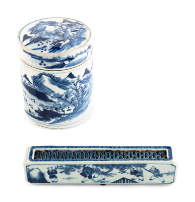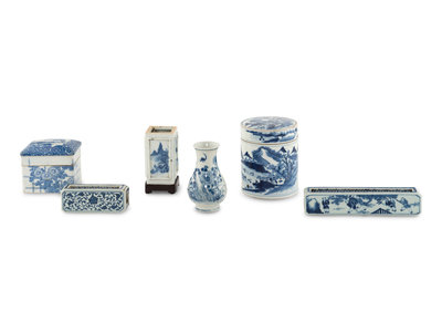 comprising two reticulated scroll weights, the smaller one bearing a with Qianlong nian zhi mark, a square brush pot, a Japanese covered box with ink well and a covered cylindrical jar.