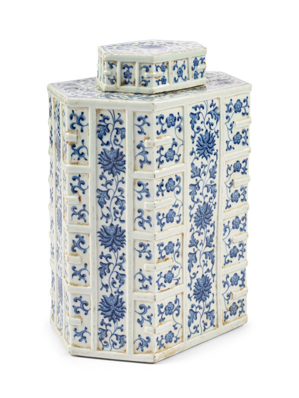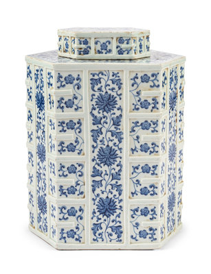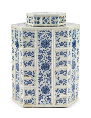 A Large Chinese Blue and White Hexagonal Porcelain Jar and Cover