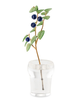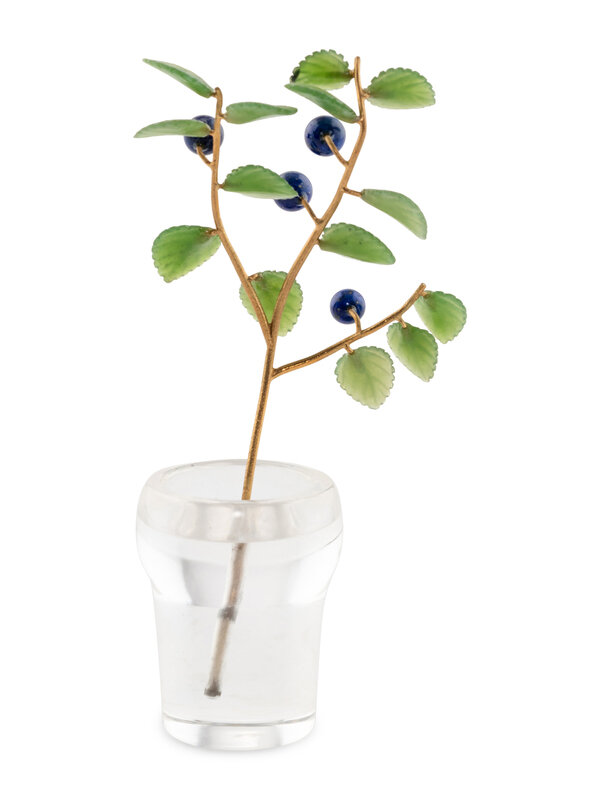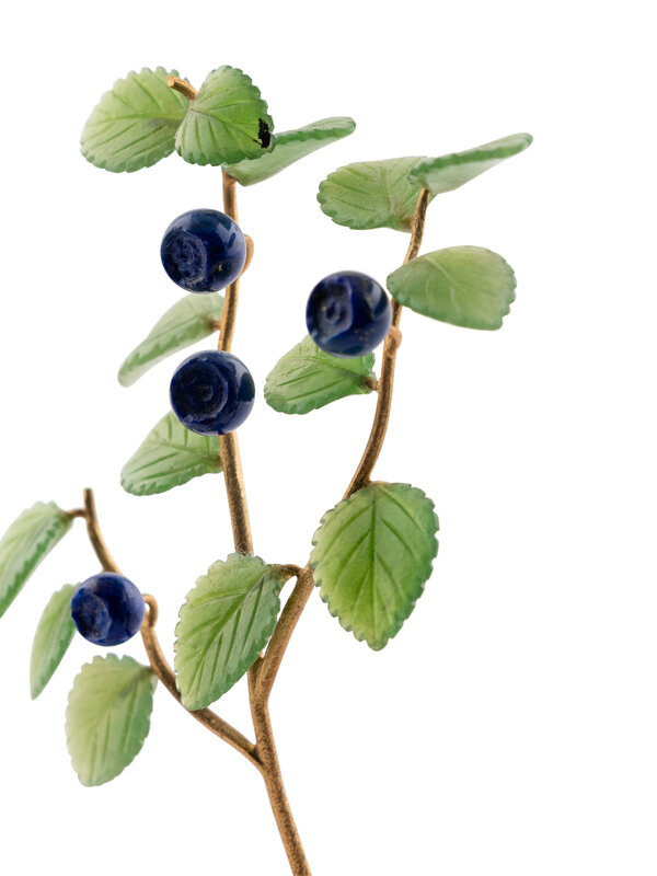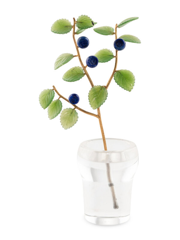 A Carved Rock Crystal, Nephrite, Lapis and 18-Karat Gold Blueberry Plant Study