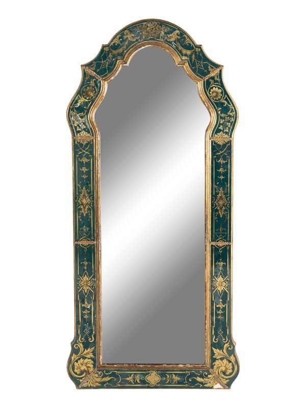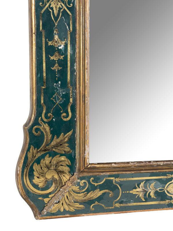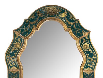 A Baroque Style Reverse Painted Glass and Giltwood Mirror