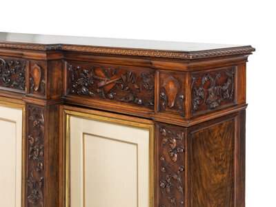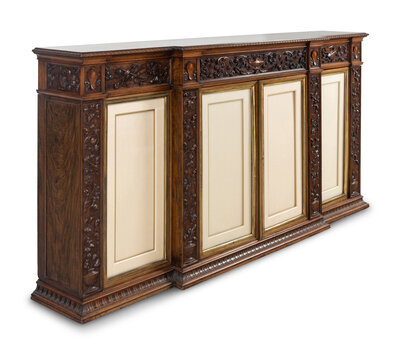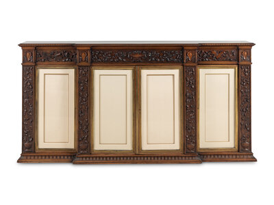 with fabric upholstered and glass inset doors, stamped 'Morison and Co. / Edinburgh' and numbered 'A1245' to the reverse.