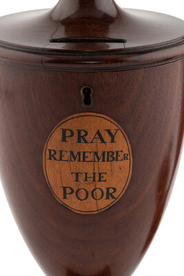 one example with a hinged lid and coin-slot cut into lid surmounting a body with a roundel decorated with the phrase 'Pray Remember The Poor', the other example with a lift-off lid surmounting a body with a roundel decorated with the letters 'ARB'.