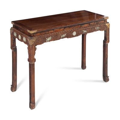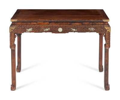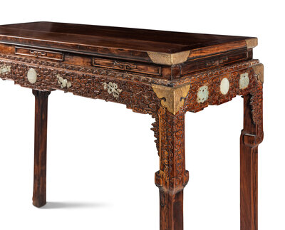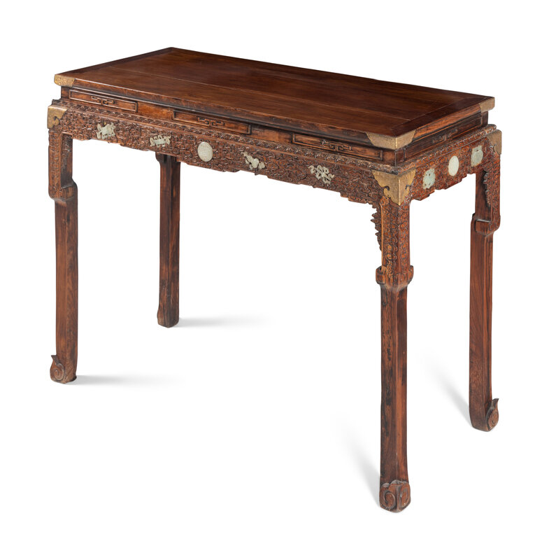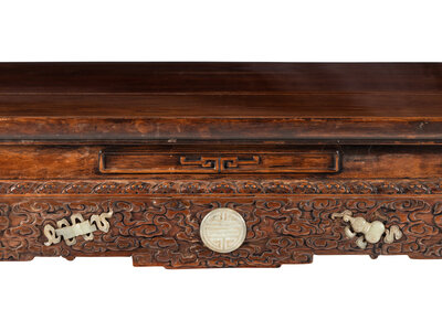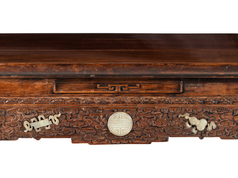 A Chinese Carved Hardwood and Celadon Nephrite Jade-Inset Console Table