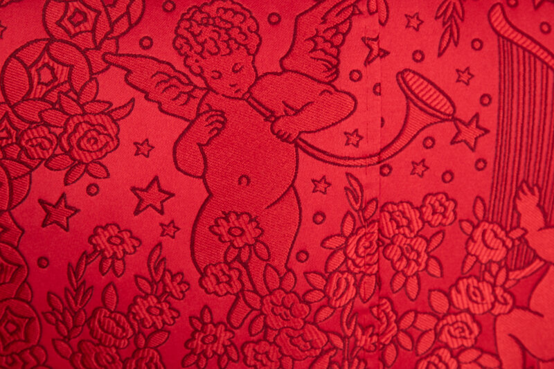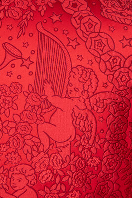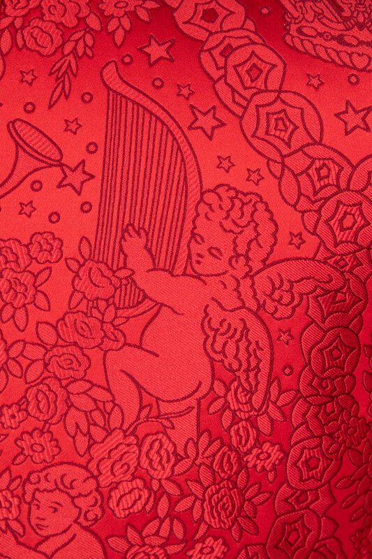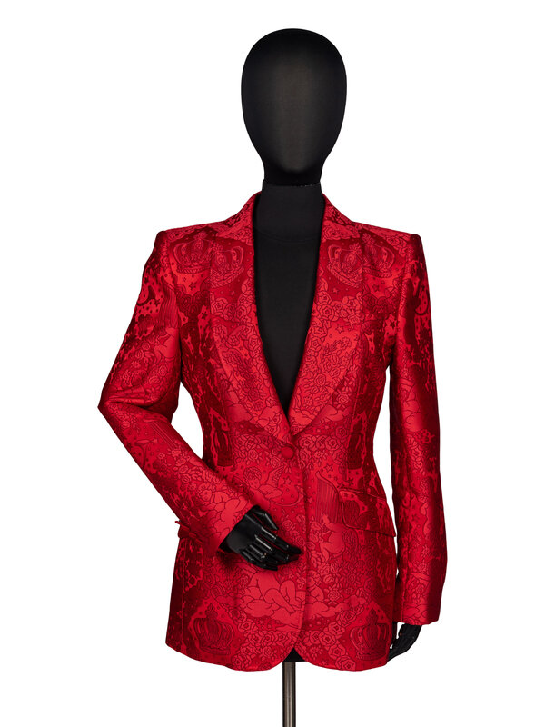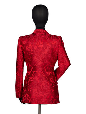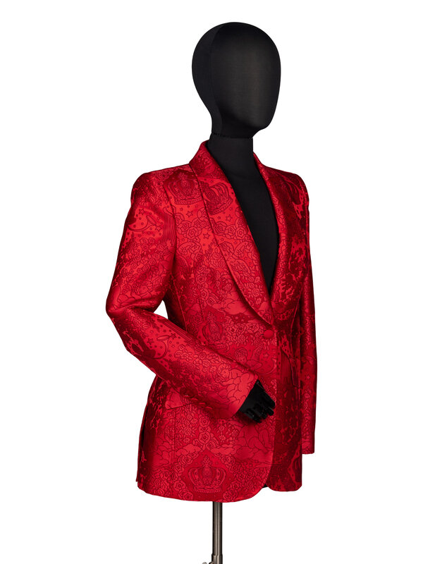 Tuxedo jacket in crimson jacquard with all-over cherub, crown, and floral motifs. Single button closure at front. Two welt pockets with flaps at front. Fully lined in baby pink silk.