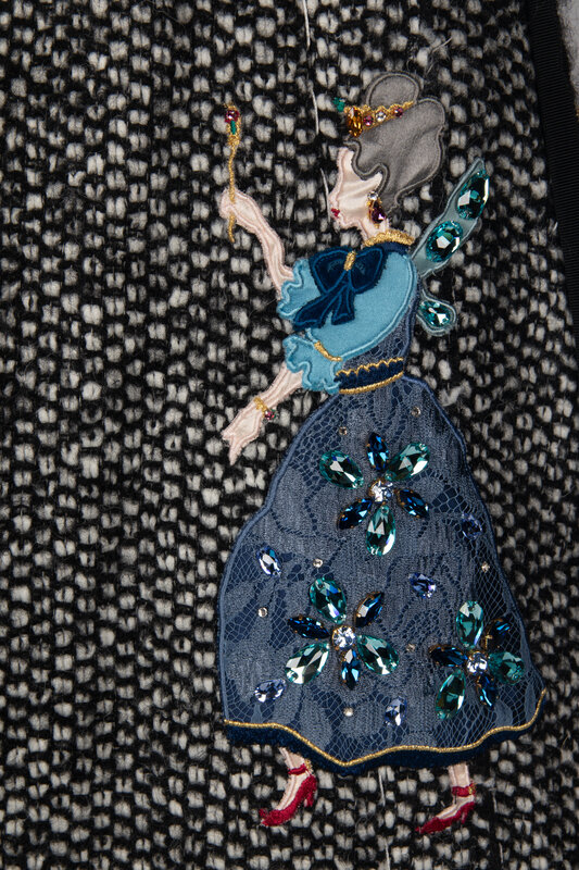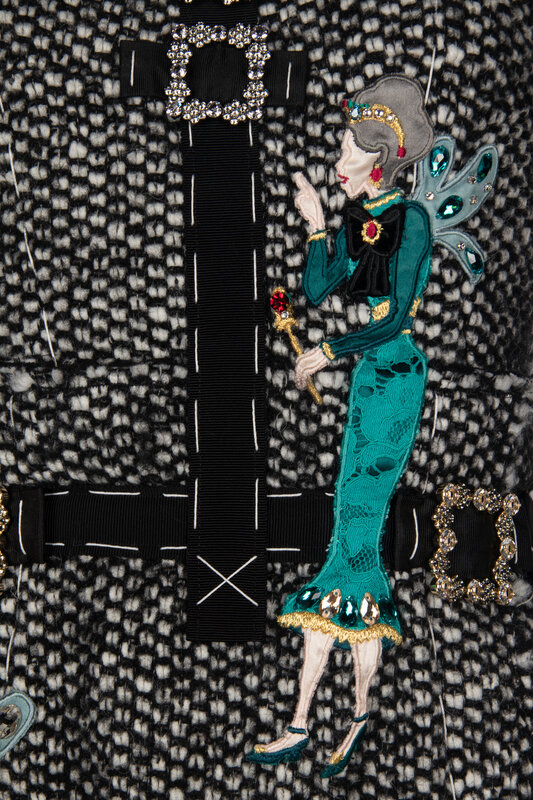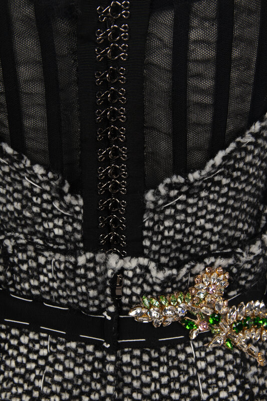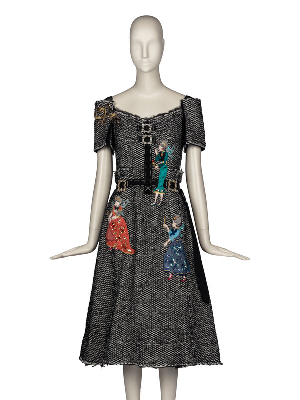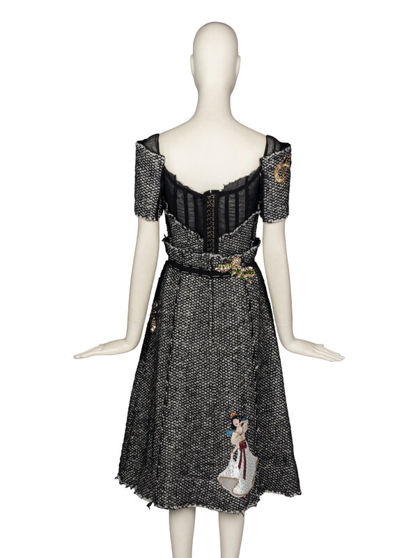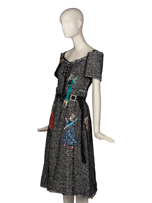 Short sleeve dress in black and white tweed with embroidered and beaded appliqués throughout; fairy godmother motif appliqués throughout. Black petersham trim and large white decorative stitches throughout. Internal stretch mesh corselette with boning at interior; slightly exposed at back. Zipper & hook-and-eye closures at back of corselette and zipper closure at back of dress. Fully lined in black mesh.
