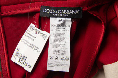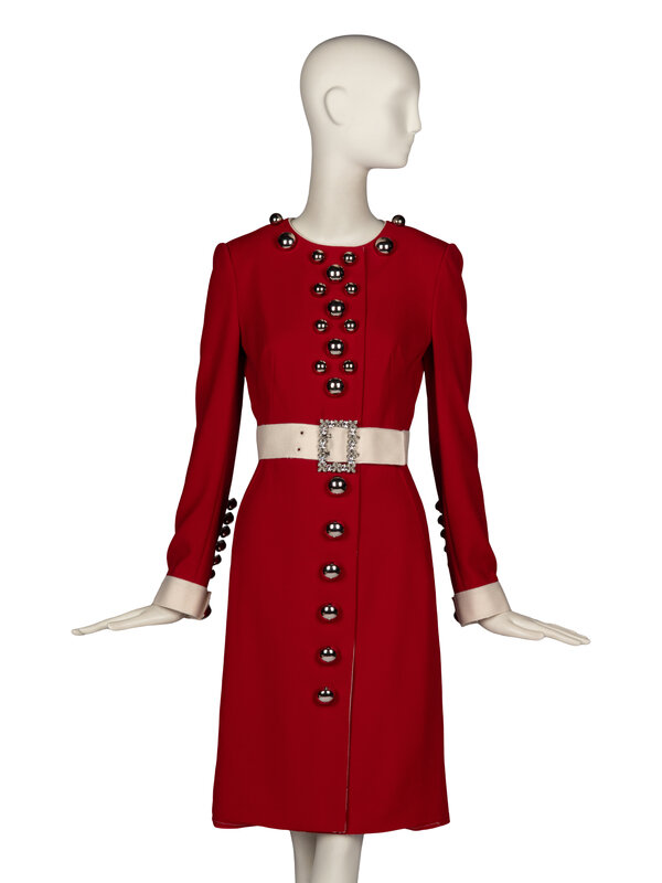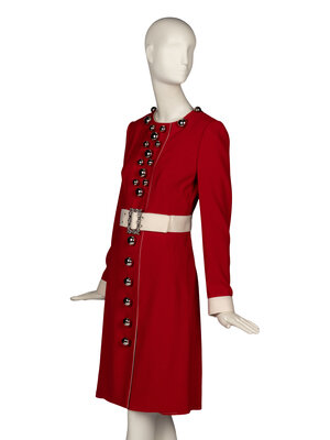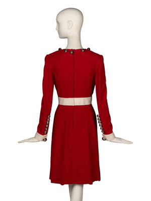 Knee-length, long sleeve fitted dress in red wool-blend with ivory-colored wool trim. Slight stretch. Silver metal bauble embellishments throughout. Attached belt with silver-tone metal and rhinestone buckle. Concealed zipper closure at back, snap closures at back of belt. Unlined.