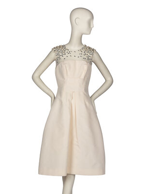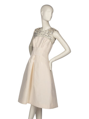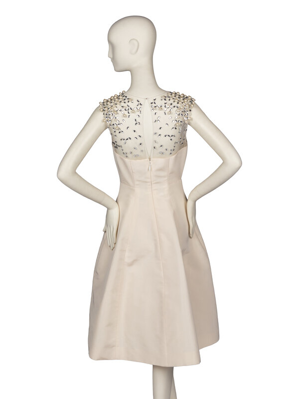 Fit-and-flare sleeveless cocktail dress in off-white silk faille with sheer tulle and beading at décolleté. Rounded neckline at chest, large box pleat at center of skirt. Hidden side seam pockets at hips. Semi-structured skirt with crinoline. Zipper closure at back with hook-and-eye at back of neckline. Fully lined in silk.