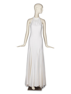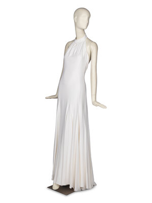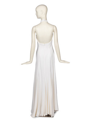 Halter-neck sleeveless gown in white satin woven, with moderate stretch. Flared skirt with godets. Neckline dips to mid-back. Hook-and-bars and snaps at back neckline. Invisible zipper closure at back. Doubly lined with high-stretch elastic shapewear as innermost lining.