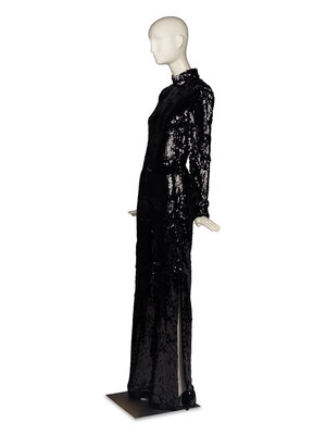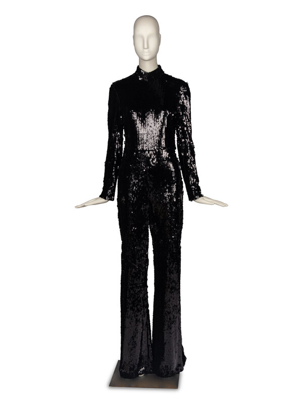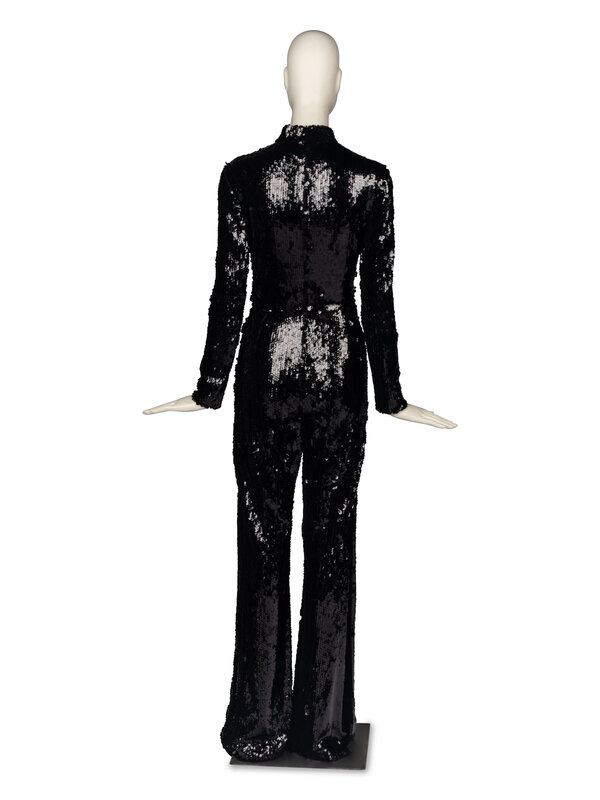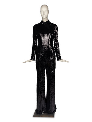 Sequined jumpsuit in black. Long sleeves, high neck, and flared legs. Somewhat stretchy. Slits up to knee at leg side seams. Fully covered in large black sequins, fully lined in black silk. Zipper closure at back with hook-and-eye at neck.