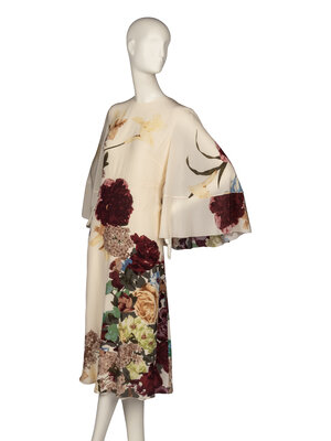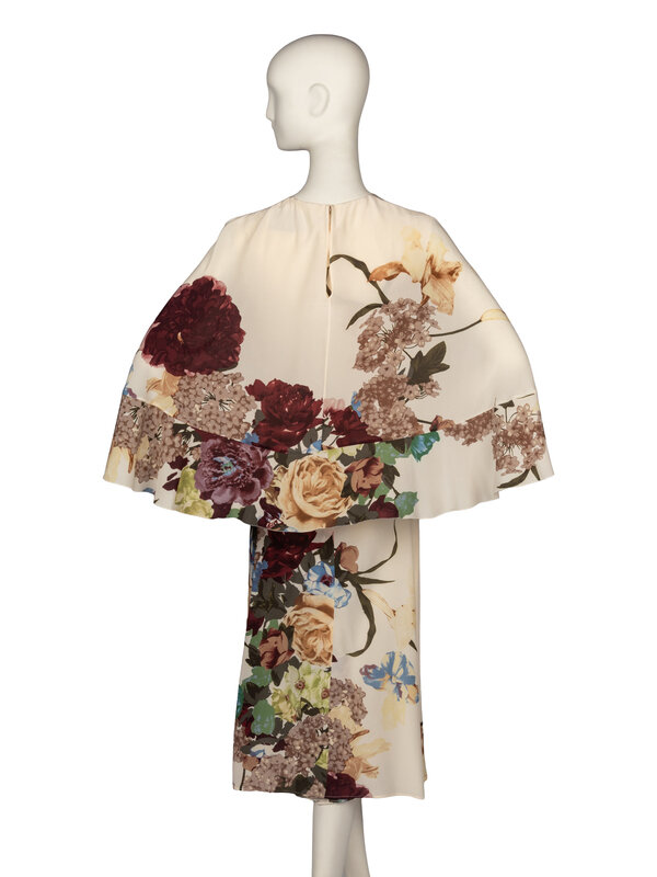 Sheath midi dress with attached capelet in cream silk with all-over multicolor large floral print. Sleeveless and collarless. Zippered closure at back with hook-and-eye at neck. Fully lined in silk except for the capelet.
