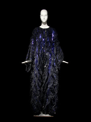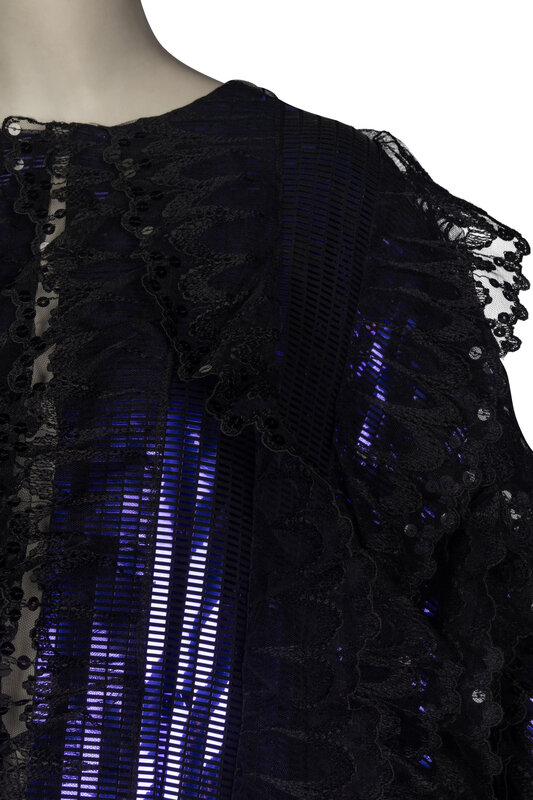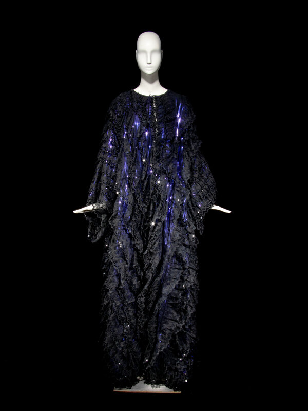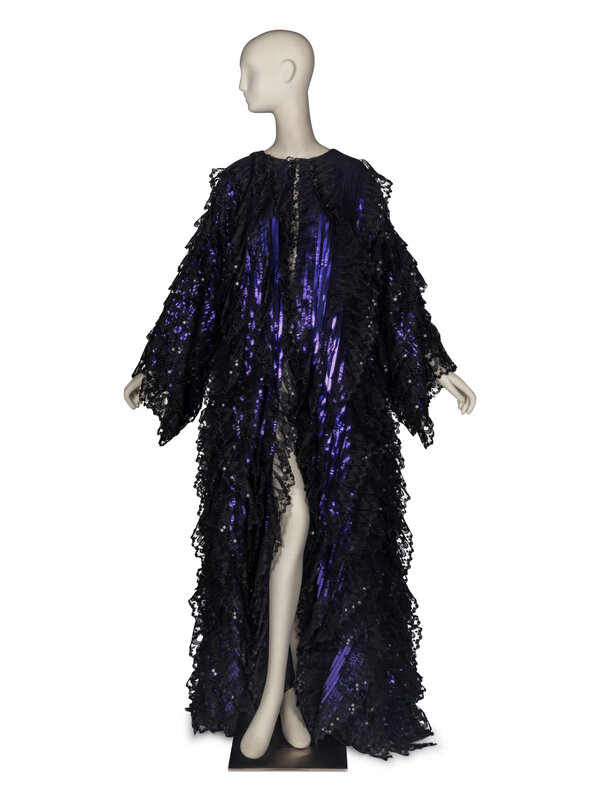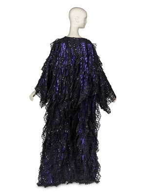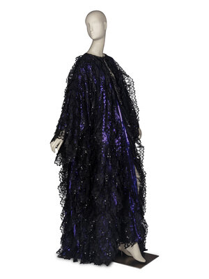 Full length evening coat. Many layers of black scalloped-edge embroidered lace atop a foundation of black fabric covered with small rectangular violet sequins. Dropped shoulder, full length, open front with a hook-and-eye closure at the neckline. Lined with satin.