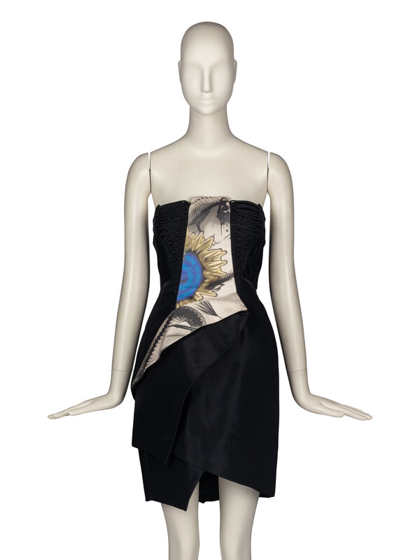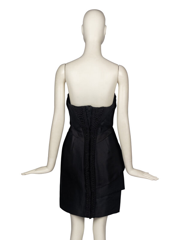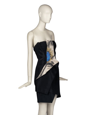 Strapless black cocktail dress with woven accents and paneled construction. Contrasting silk panel printed with abstract forms. Double-layered back zip closures. Boning, support within bodice.