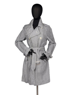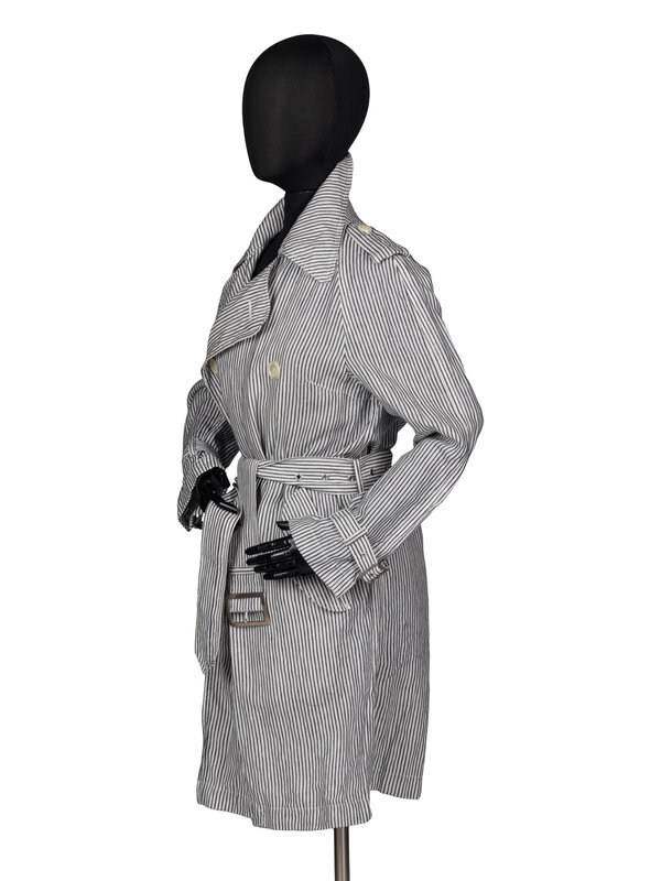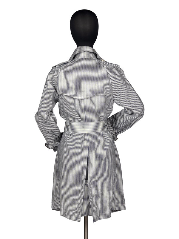 Double-breasted trenchcoat in striped navy & white linen. Notch-lapel collar with additional buttonholes. Raglan sleeves with epaulette tabs at shoulders, adjustable belts at wrists. Self-fabric belt with silver-tone metal buckle. Button closures at front. Unlined.