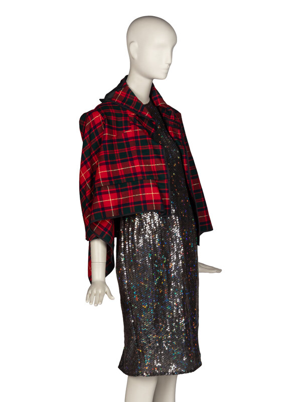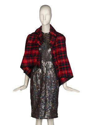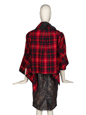 Short asymmetrical deconstructed boxy jacket in red wool-blend plaid. 3/4 length sleeves, draped back of of bodice. Asymmetric shawl collar. No closures. Unlined.