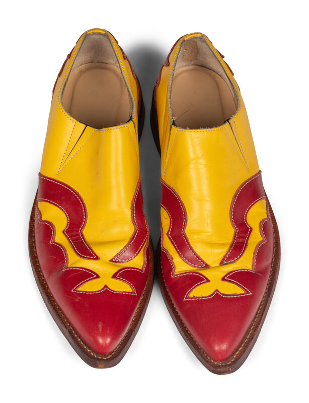 Pointed low-top wing-tip style shoes in red and yellow leather. Lined in beige leather. Elastic gussets at upper edges.