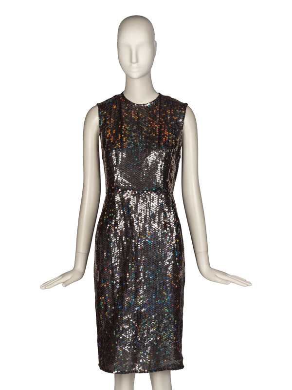 Tailored sheath dress in all-over dark grey holographic sequins. Knee-length, sleeveless and collarless. Concealed zipper closure at back with hook-and-eye and neckline. Unlined.