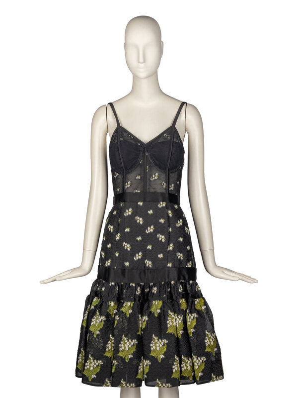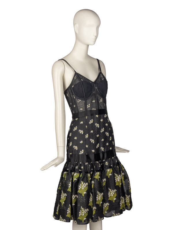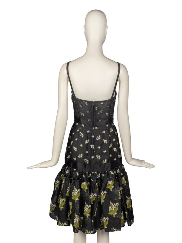 Peplum-hem bustier dress in black jacquard with green & white floral motifs throughout. Lightly structured bustier with boning in black sheer mesh; built-in bra cups and thin straps. Sweetheart neckline. Peplum-hem flounce full skirt. Black satin bands throughout. Invisible zipper closure at back. Partially lined.
