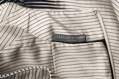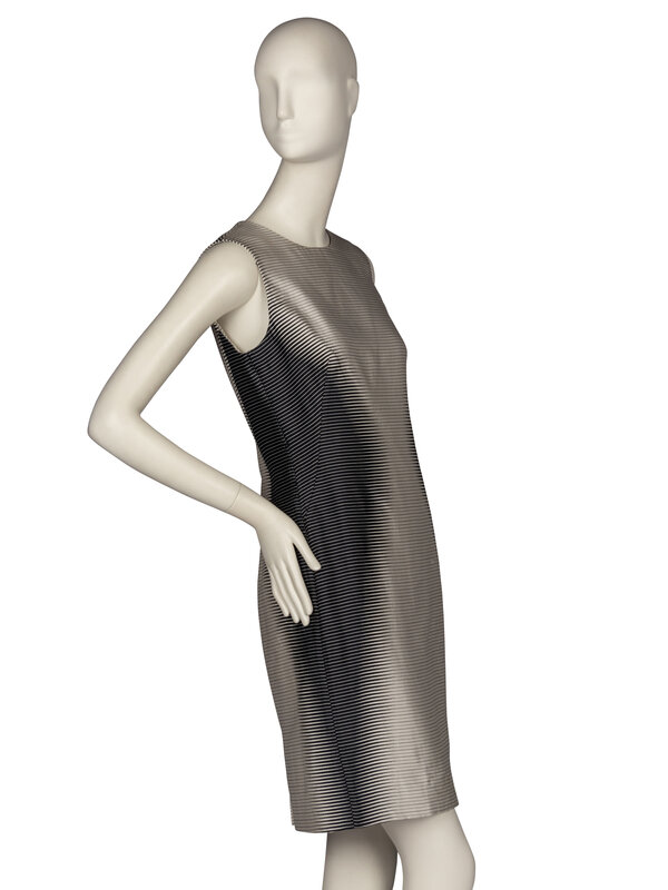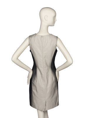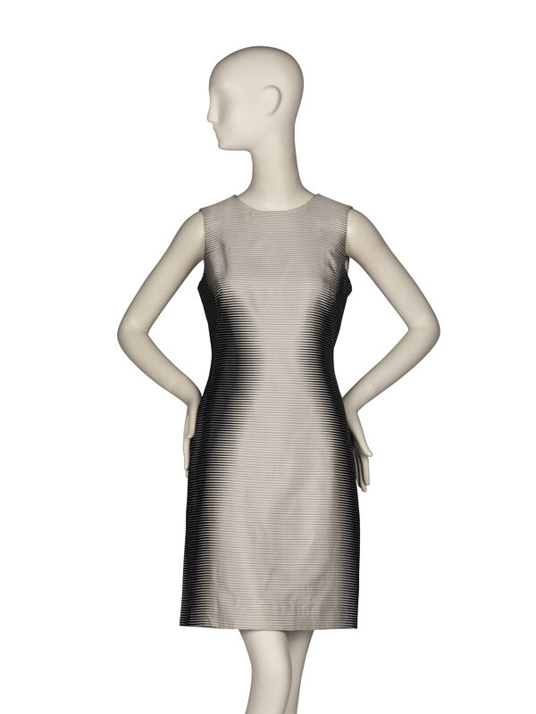 Sleeveless mini dress in gradated black and white stripe pattern. Crew neckline, darts at bust, back vent. Back zip closure.